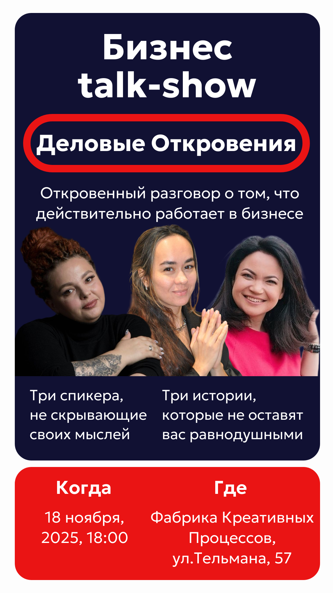 на бизнес talk-show "Деловые Откровения"! Это уникальное мероприятие, где вы станете частью интерактивных дискуссий и услышите вдохновляющие истории успеха от ведущих экспертов и предпринимателей.